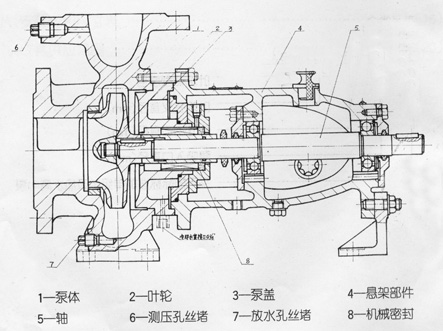 軸封形式采用不平衡單端面機(jī)械密封,軸封室外設(shè)有水冷卻套,可以通過泵側(cè)面1/4管接口接通外來冷水,對軸封進(jìn)行冷卻。