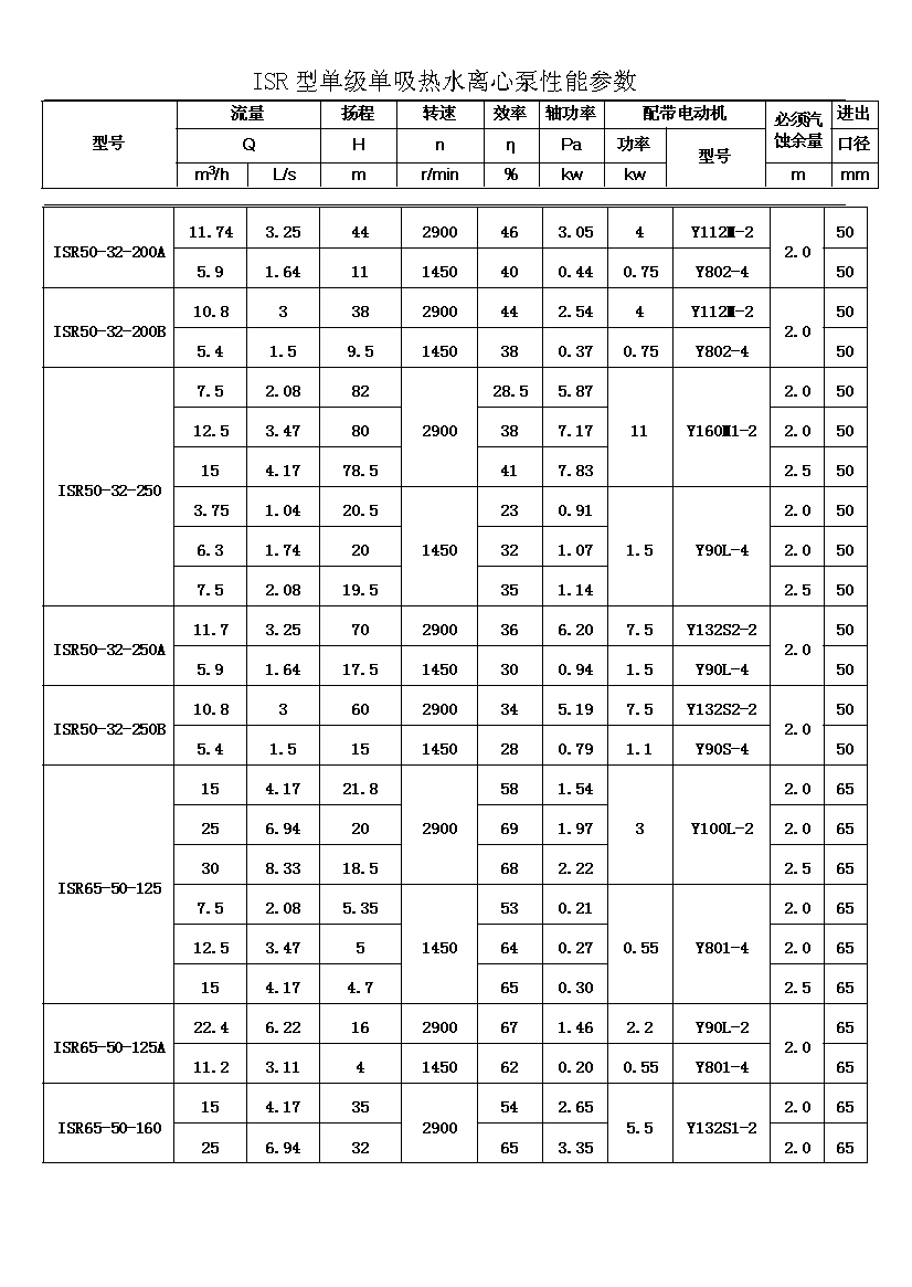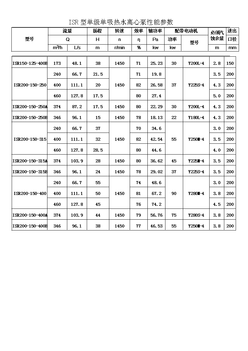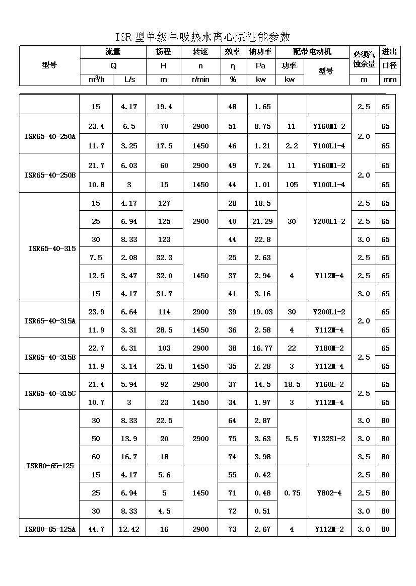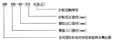 ISR系列單級單吸熱水離心泵共有二十九種基本型,為滿足用戶對泵的不同性能要求,我廠采用了切割葉輪外徑的方法,從而增多了ISR泵的規(guī)格。