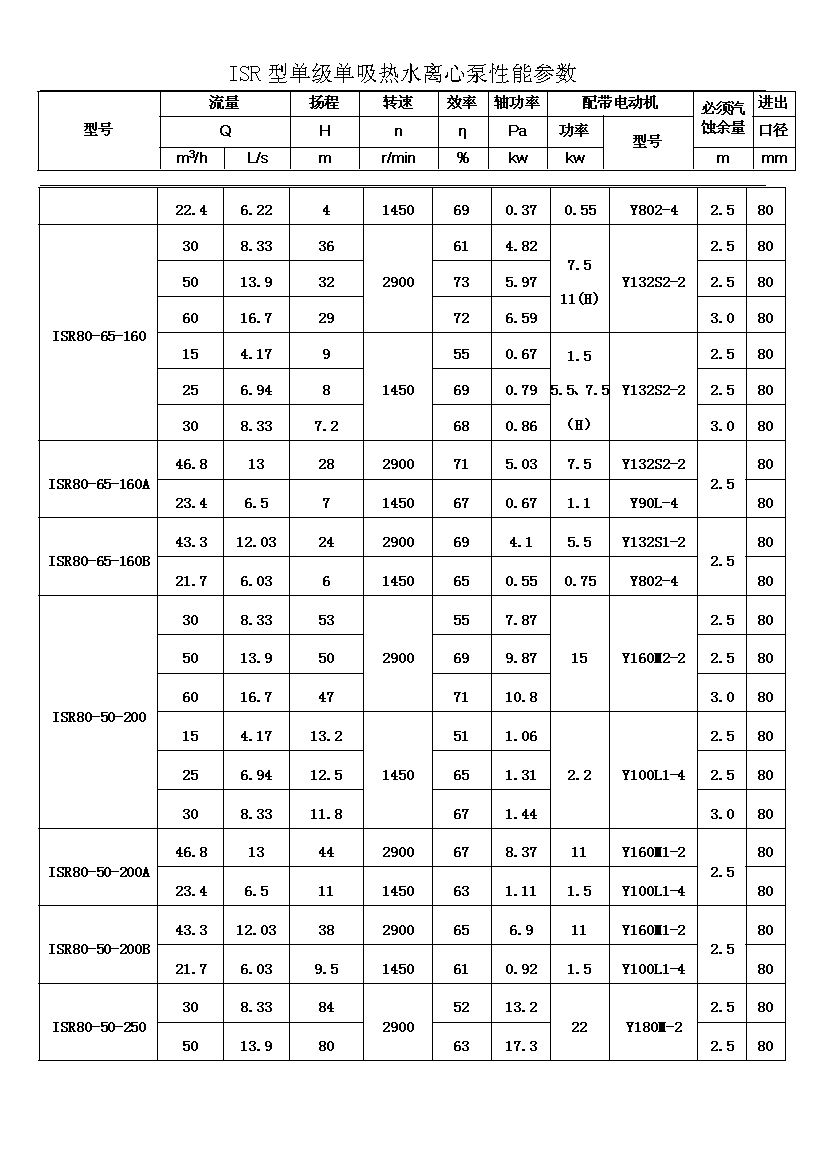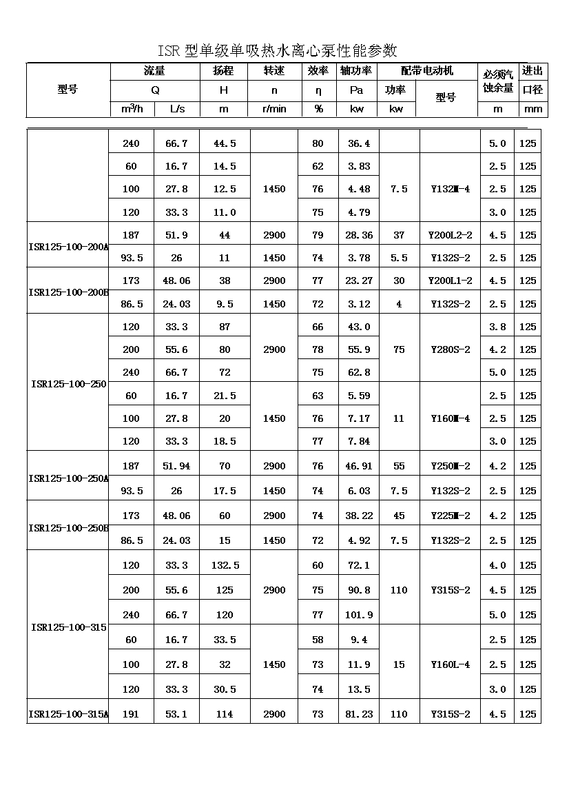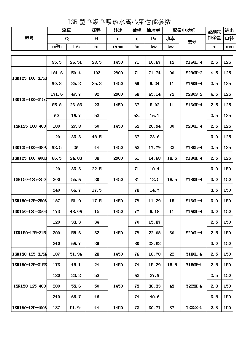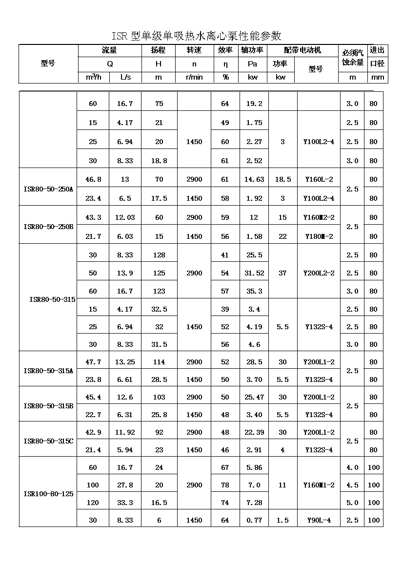 ISR系列單級單吸熱水離心泵共有二十九種基本型,為滿足用戶對泵的不同性能要求,我廠采用了切割葉輪外徑的方法,從而增多了ISR泵的規(guī)格。