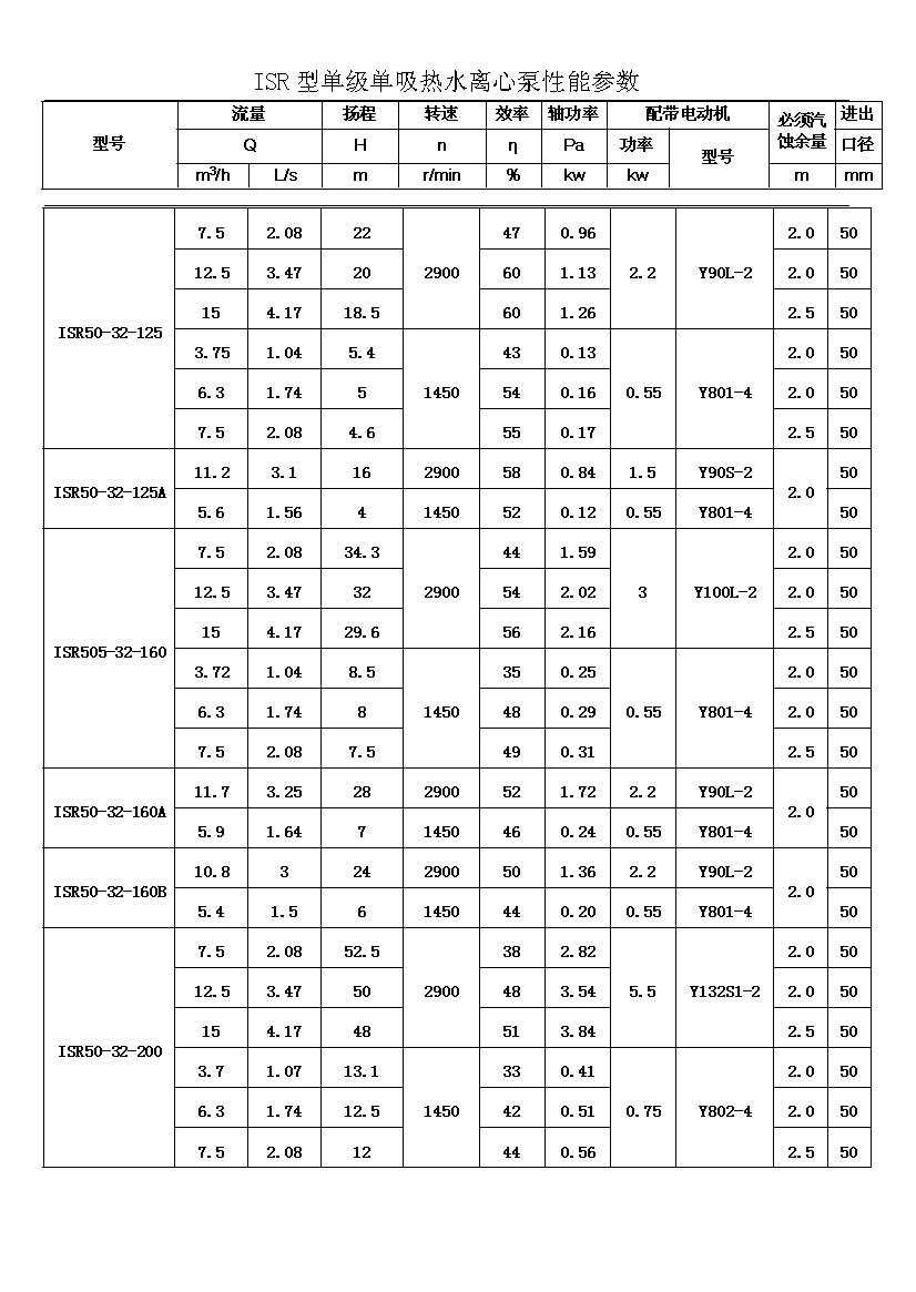 ISR系列單級單吸熱水離心泵適用于輸送不含固體顆粒的清水或物理化學(xué)性質(zhì)類似于清水的其他液體,被輸送介質(zhì)的溫度在-20℃~+150℃之間,泵的***高工作壓力布大于1.6MPa,吸入口壓力不大于0.8MPa,適用于工廠、礦山、城市給派水,特別是城鄉(xiāng)集中供熱、供水系統(tǒng)。其性能參數(shù)范圍為: